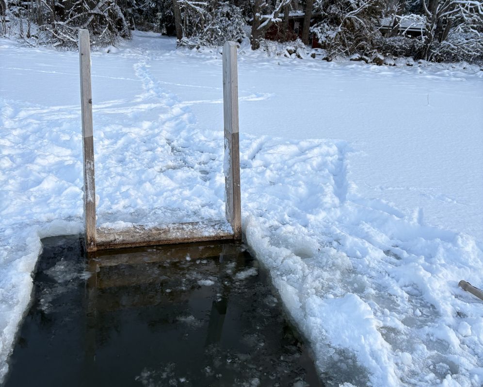 Avanto voi kannesta huolimatta jäätyä varsinkin reunoiltaan. Sen uudelleen avaamiseen on käytössä jääsaha ja tuura. Mukavia uintihetkiä.